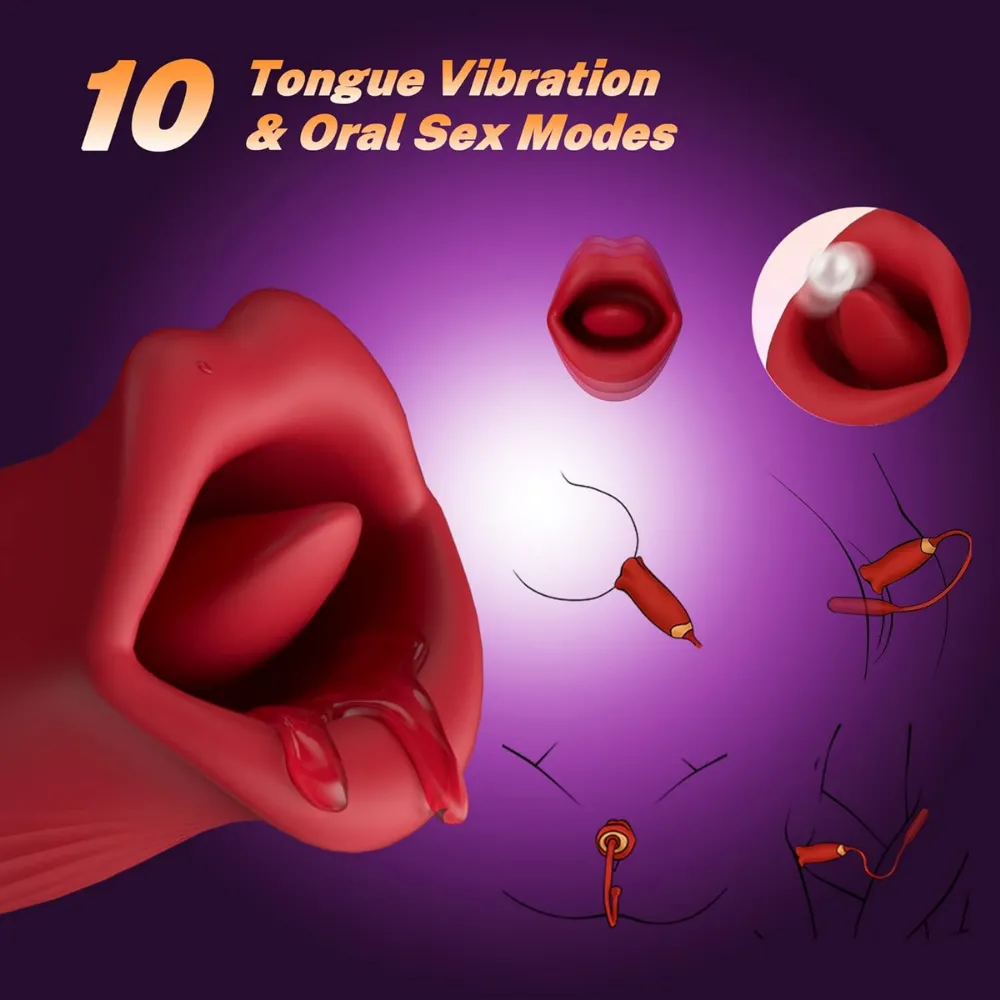 İleri geri hareketli yapay penisli 3'ü 1 arada oral seks vibrartörü, bu dudak hareketli dil vibratörü, aşağı yukarı 10 oral seks modu, 10 ileri geri hareketli mod ve 10 titreşim fonksiyonuyla birleştirilmiş 3'ü 1 arada gül oyuncağıdır.